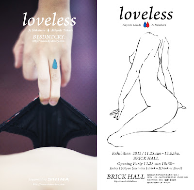 ーーーーーーーーーーーーーーーーーーーーーーloveless.Akiyoshi Takada / Ai NakaharaBRICK HALLExhibition 2012 / 11.25.sun ~ 12.6.thuOpening Party 11.25.sun 18:30~BRICK HALLEntry 1,500yen (Includes 1Drink & 1Drink or Food)Supported byREDBULL http://www.redbull.jp/SHIMA http://www.shima-hair.com/Special Thanks!INTOYOU http://www.into-you.co.uk/london/Mr.Wim http://www.misterwim.com/and my London Family!!!BRICK HALL福岡県北九州市門司区大里本町3-6-1http://www.brickhall.com/tel : 093-391-4411BYSDNTCRY.http://www.bysdntcry.com/MADBUNNYhttp://www.madbunny.net/ーーーーーーーーーーーーーーーーーーーーーー