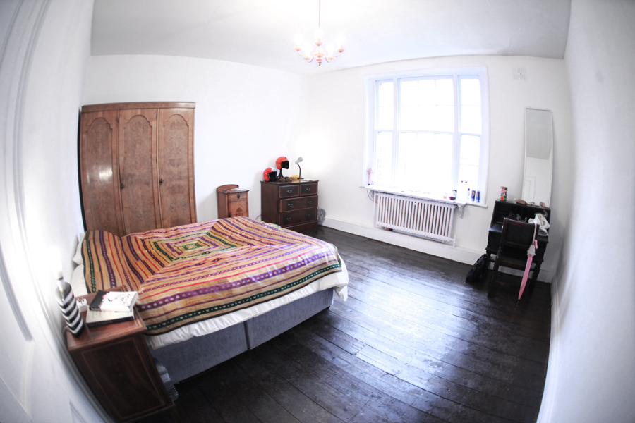 窓から差す光がとっても明るい大きな空間。アンティークの薄いピンクのシャンデリアが可愛いお部屋。バイクのヘルメットとオイル。彼女がプレゼントしてくれたベッドカバー。窓際にビール。